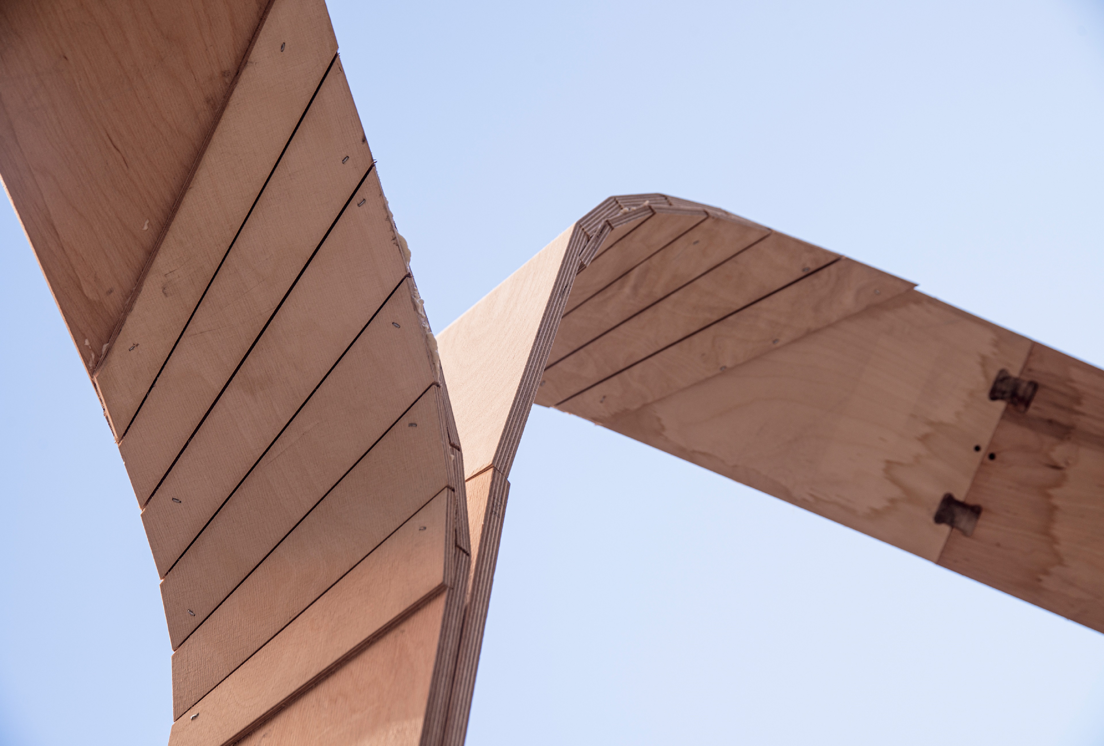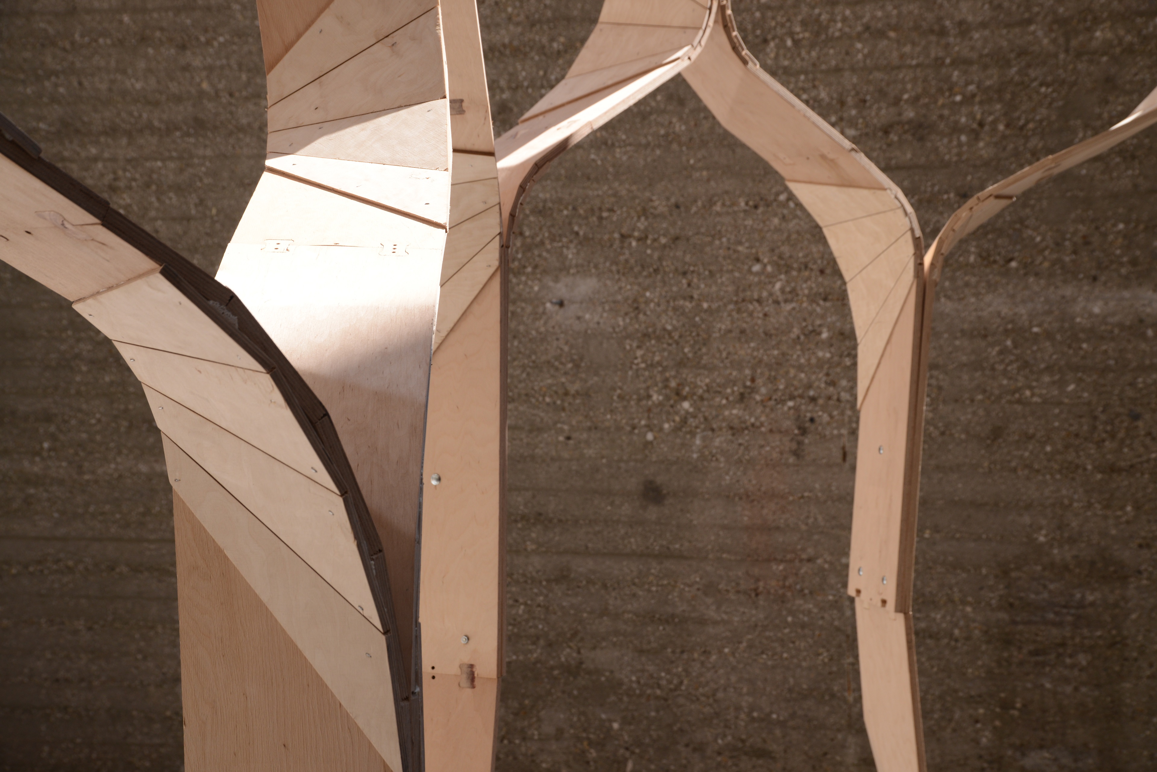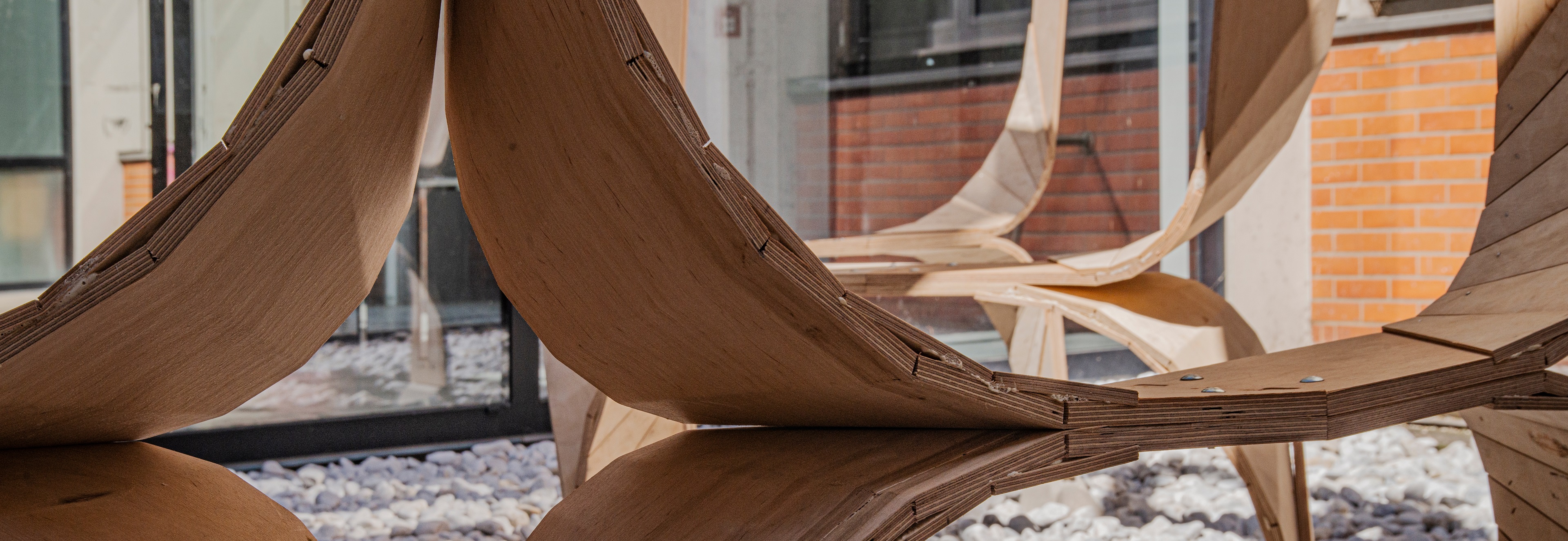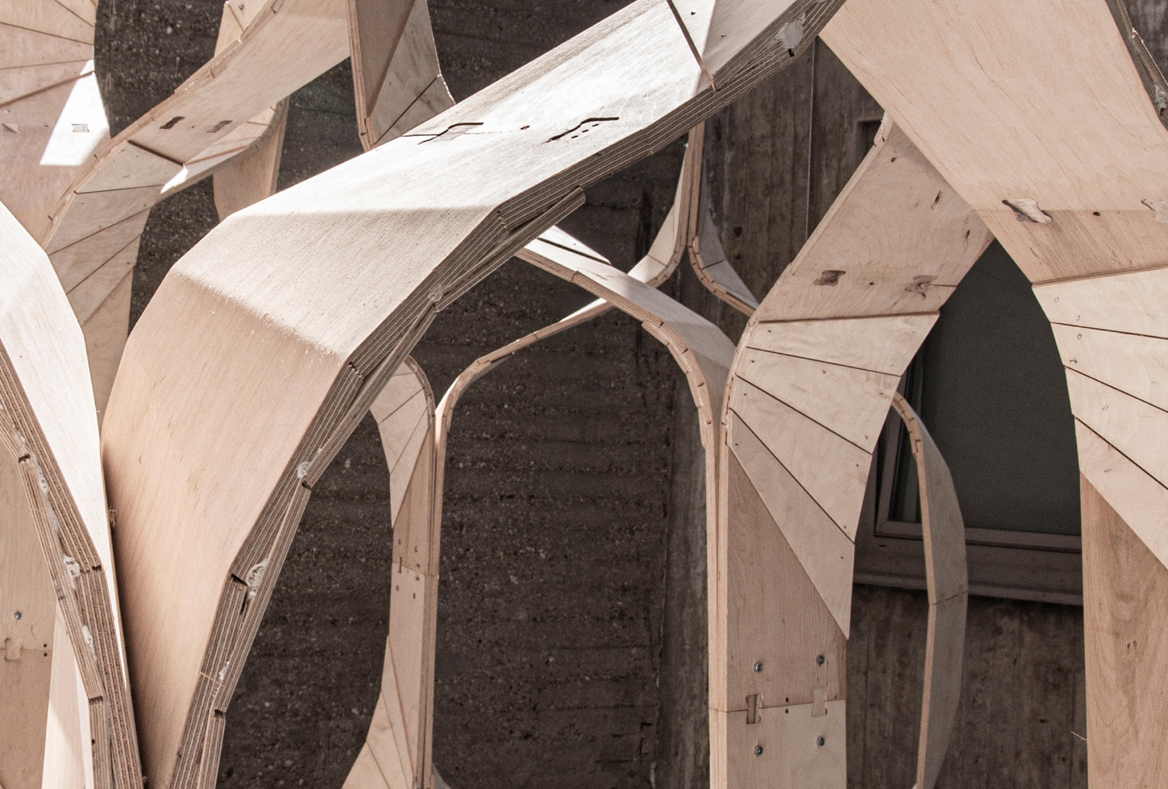 Research Pavilion emerging from a 2-semester exploration on KERF-bending through robotic 5-Axis Milling techniques