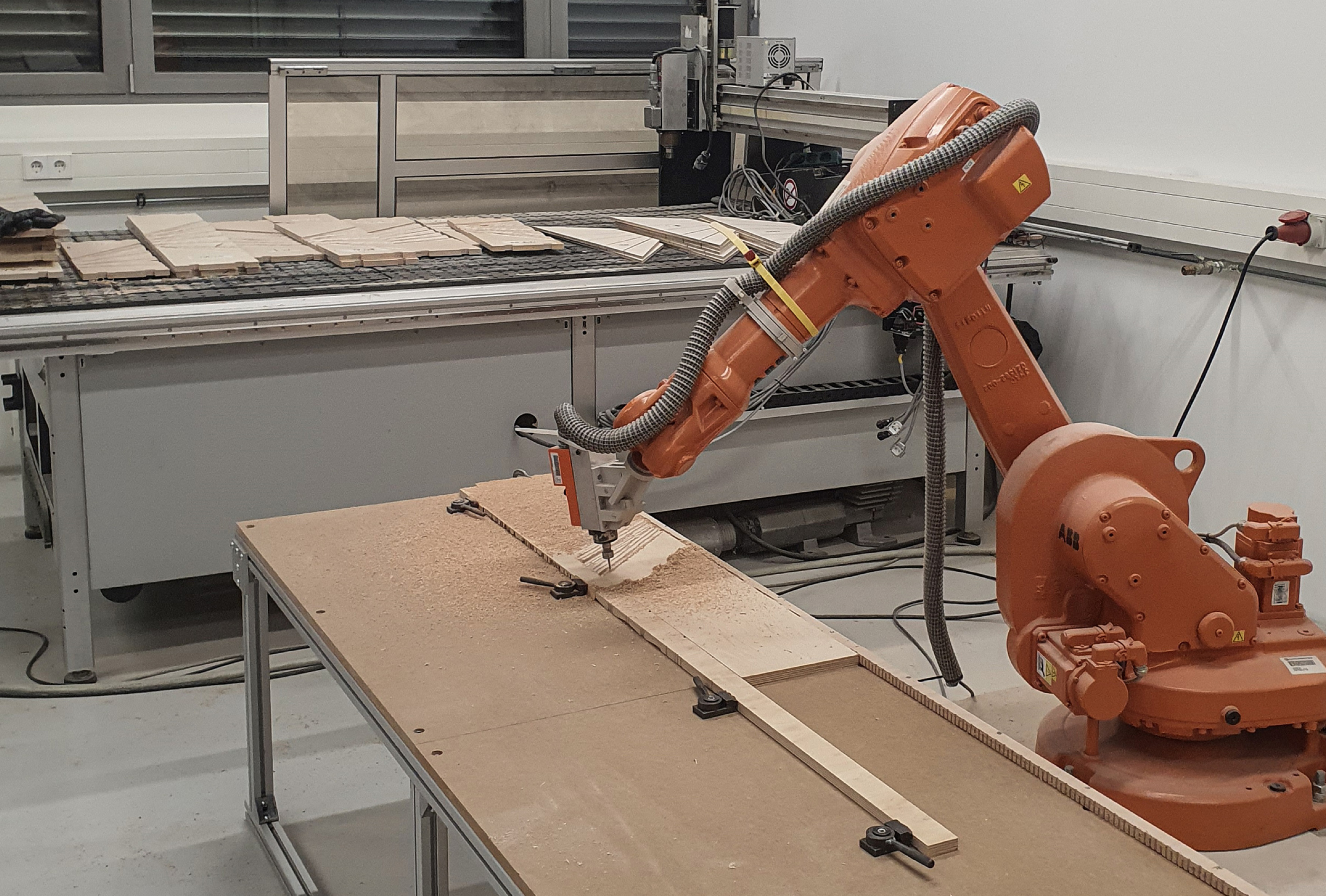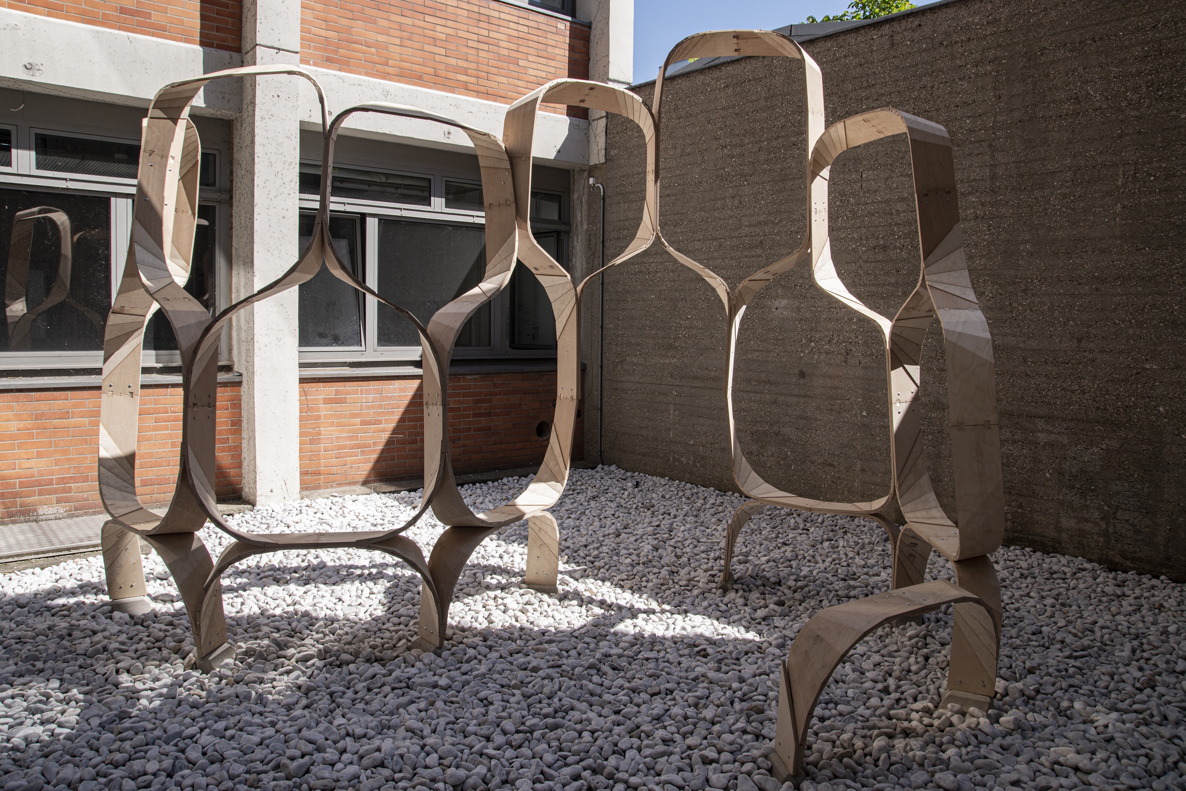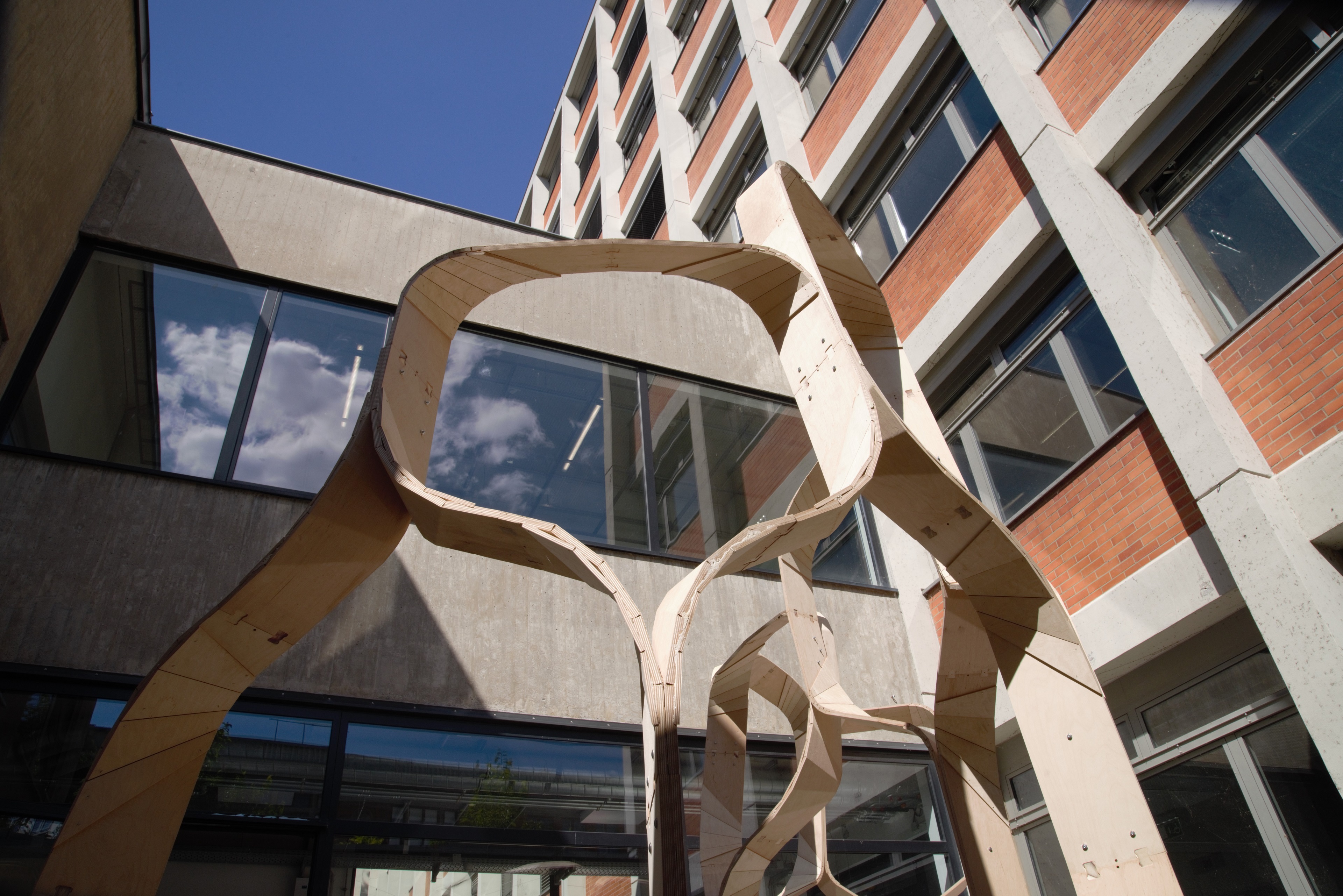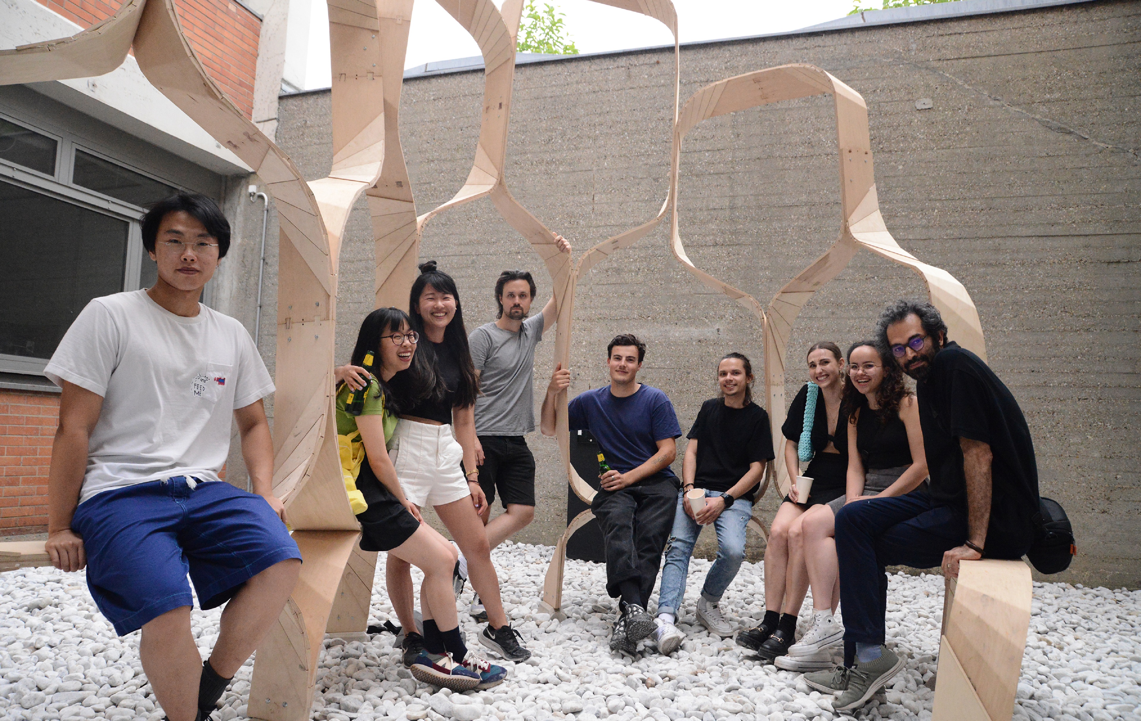 Research Pavilion emerging from a 2-semester exploration on KERF-bending through robotic 5-Axis Milling techniques