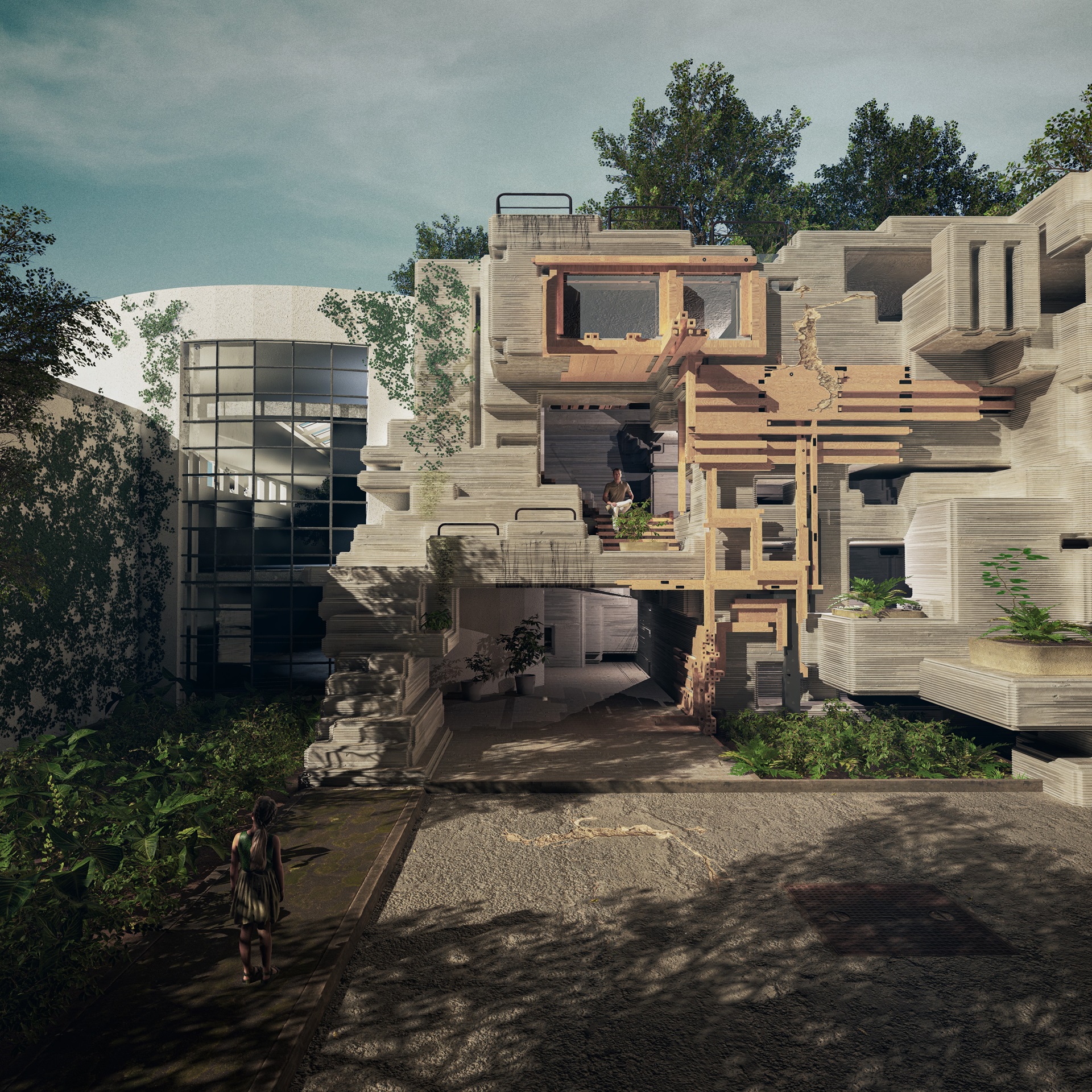 In addition to the already defined ecologic zones, the crevasses between the layers of the printed LC3 allow for the inhabitation by natural species. Through the curved surface, the microclimate is lowered in the summer by better evapotranspiration.