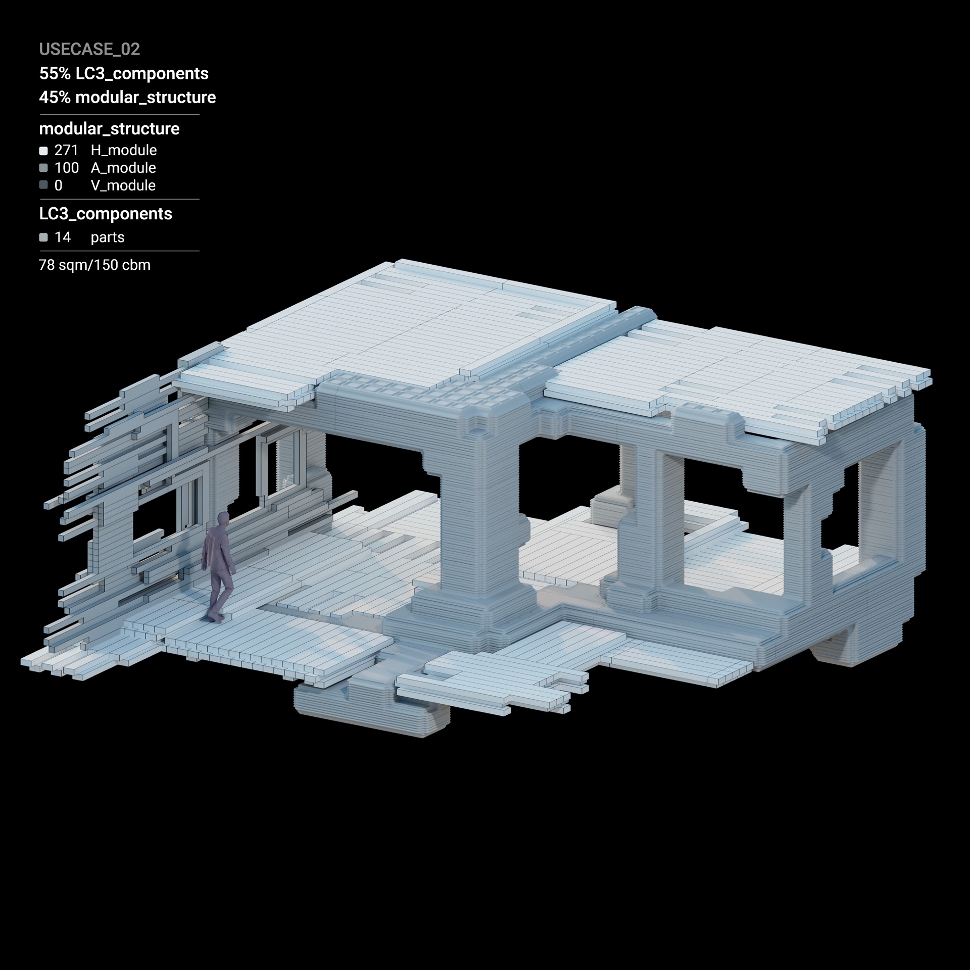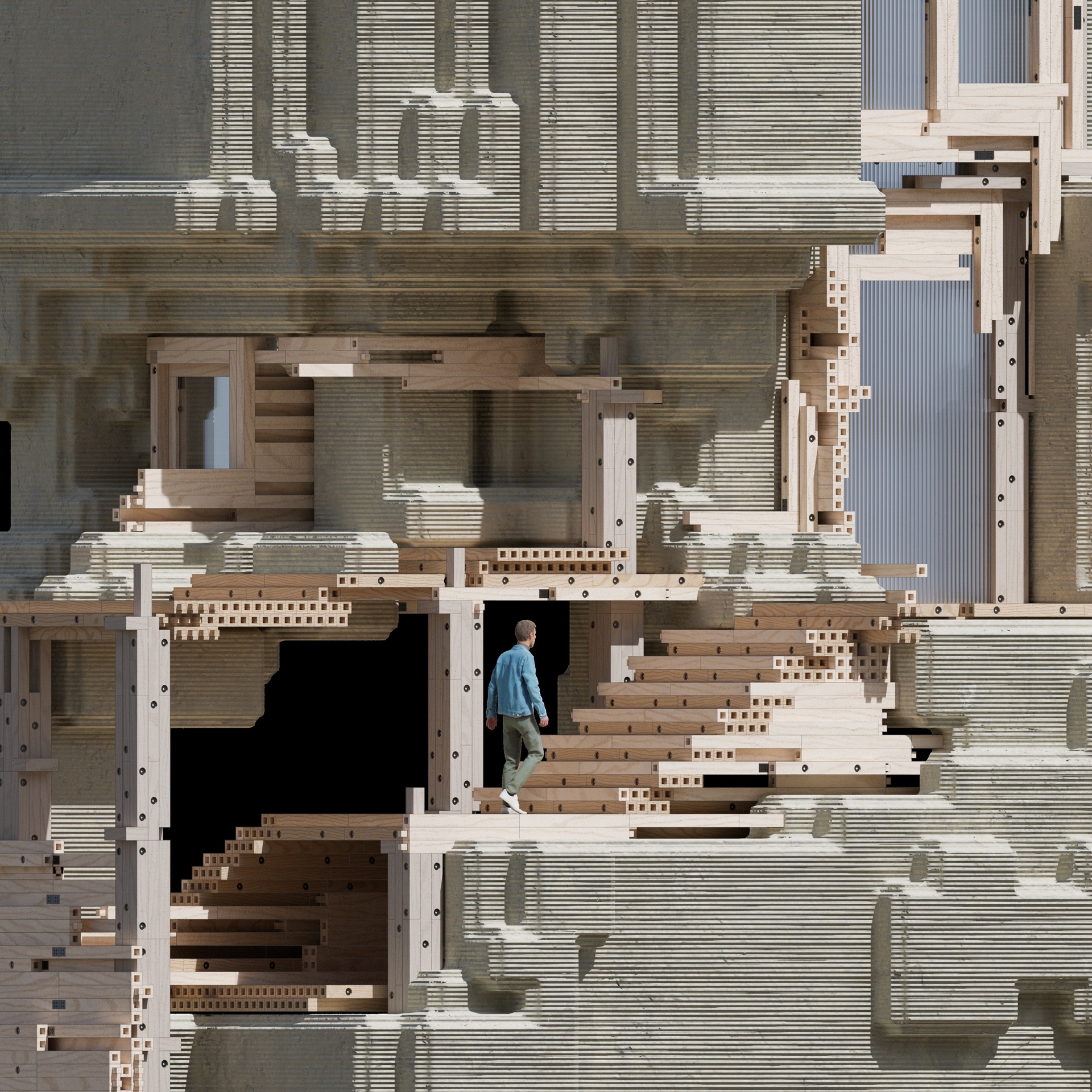 As additonal system, a modular CLT structure from regional spruce acts as beneficiary element, being able to allow monomaterialistic crosssections in respective parts.