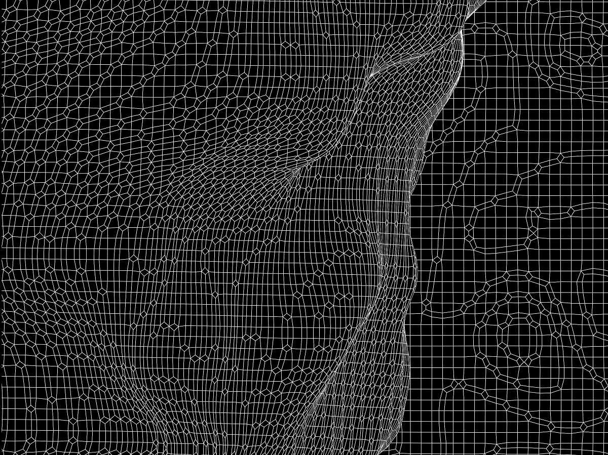 mesh structures emerging from voxelization of scan data that are not featured in their physical counterparts. with the varying reading density causes “ribbons” in the topology resulting in unexpected structures. Exceeding certain distance thresholds results in the tesselation of smaller islands that become linked by thinner ribbons.