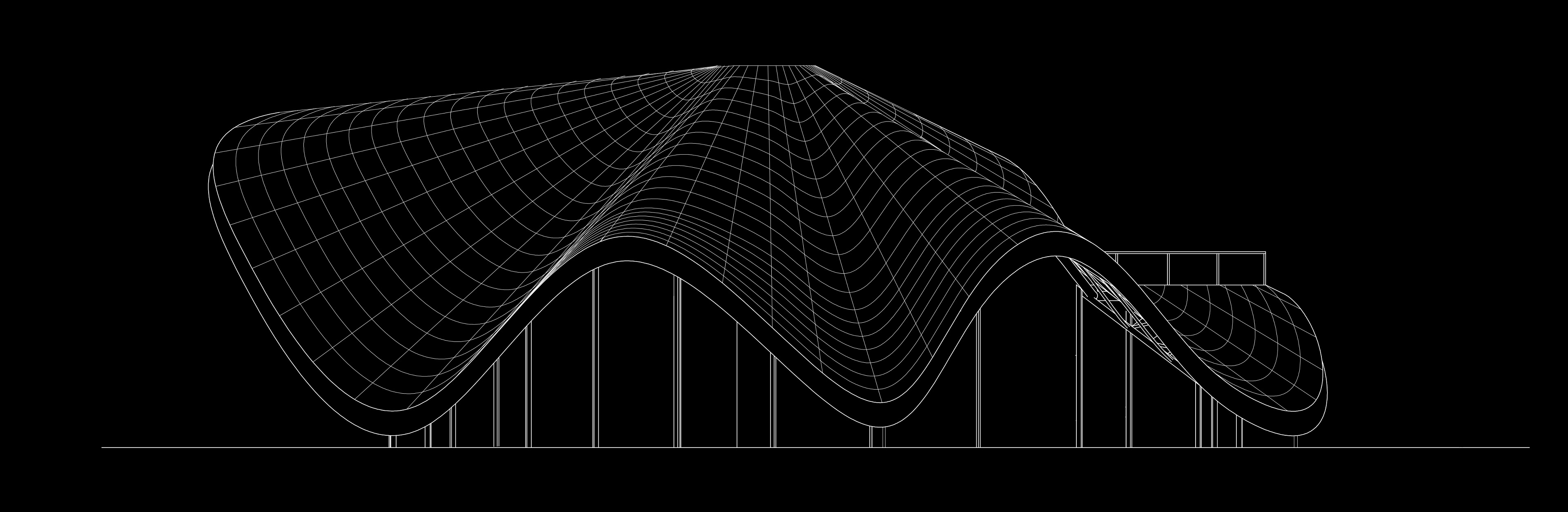 The pavilion blends with its surroundings, with the roof not only defining the interior, but also continueing to the outside. The exterior shelter spaces invite for further explorations; the visitor gets drawn towards the building and experiences a variety of spatial qualities, narrow to open, without even entering. The deck offers spectacular views by its elevation without disrupting the characteristic silhouette which continues as an imaginary trace.