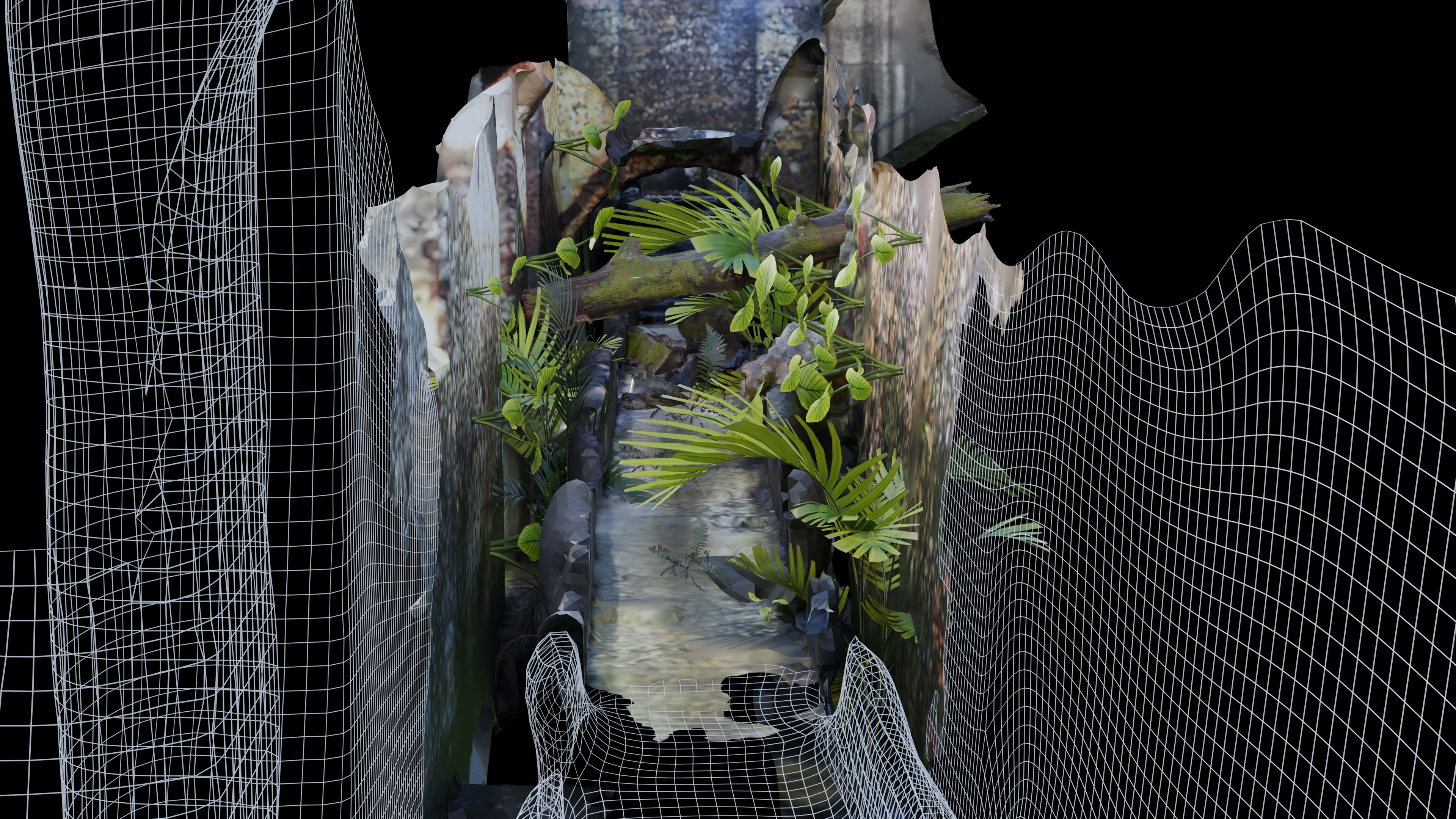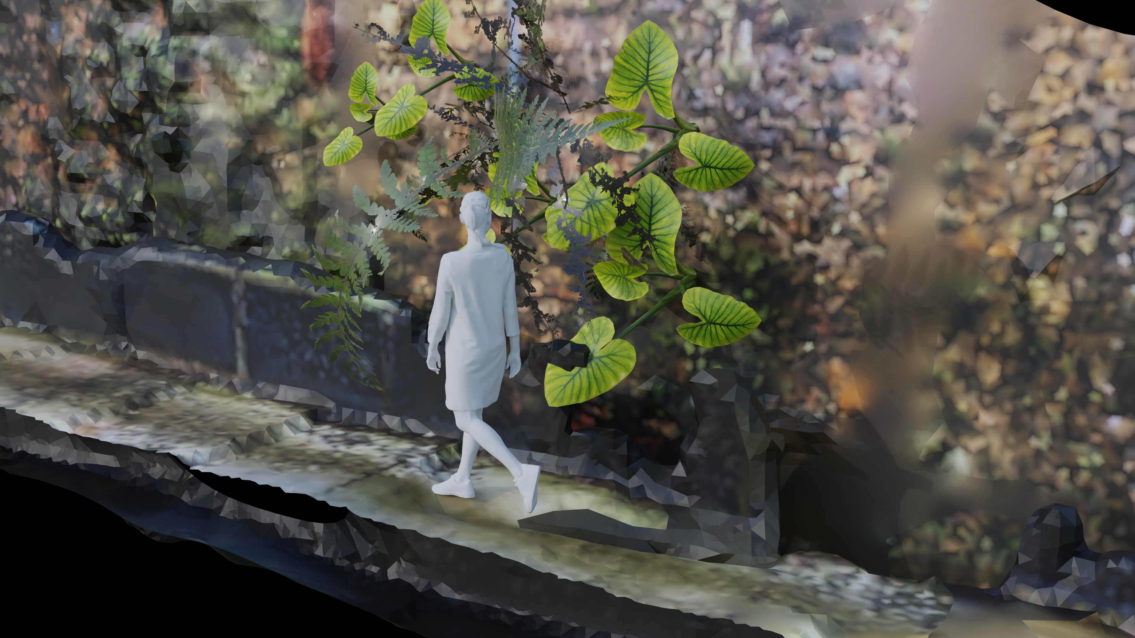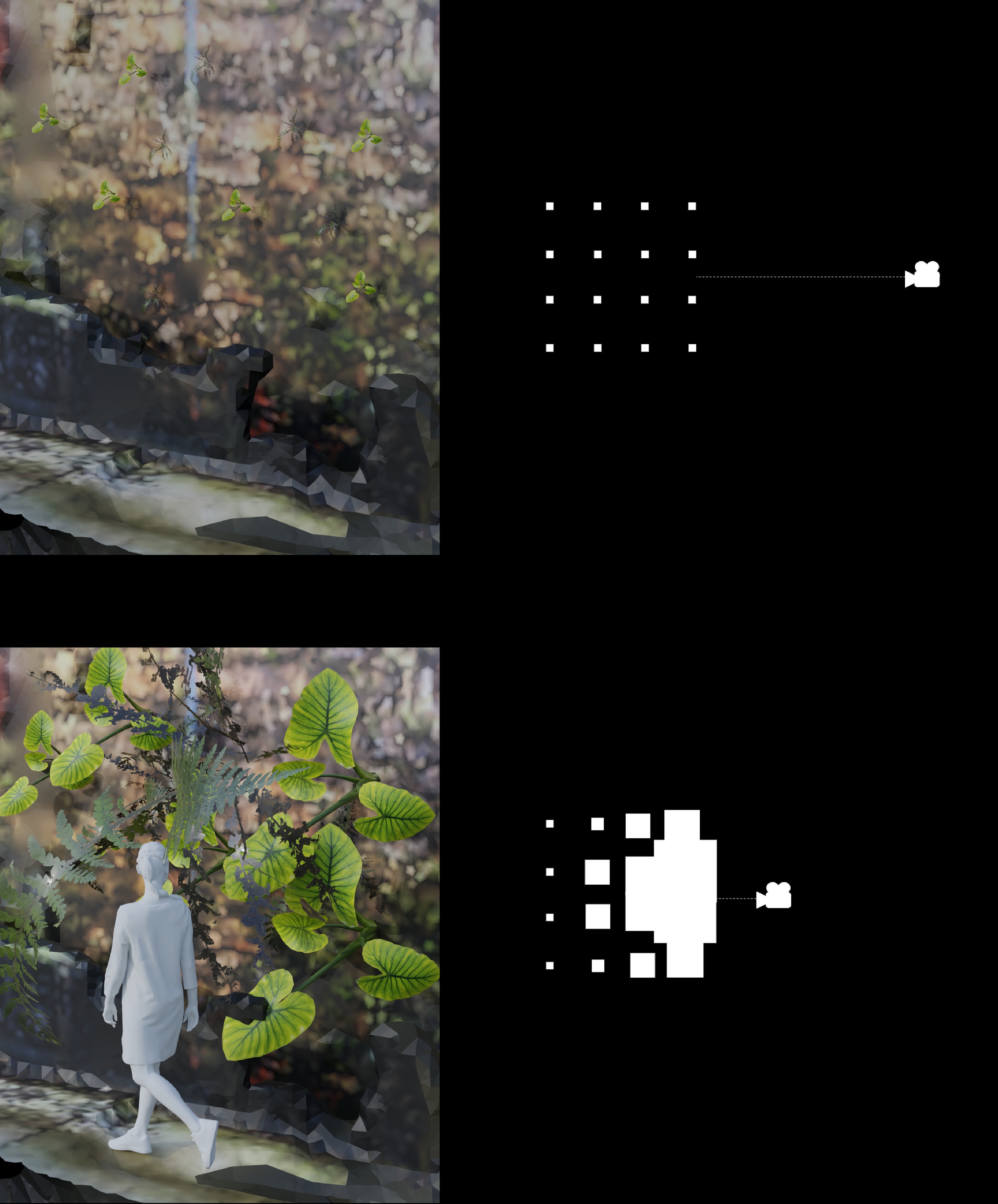 A digital nature was designed and mapped, becoming activated by the user through motion-triggered sensing. This provides an individual, interactive experience and the chance to communicate speculative futures within reality.